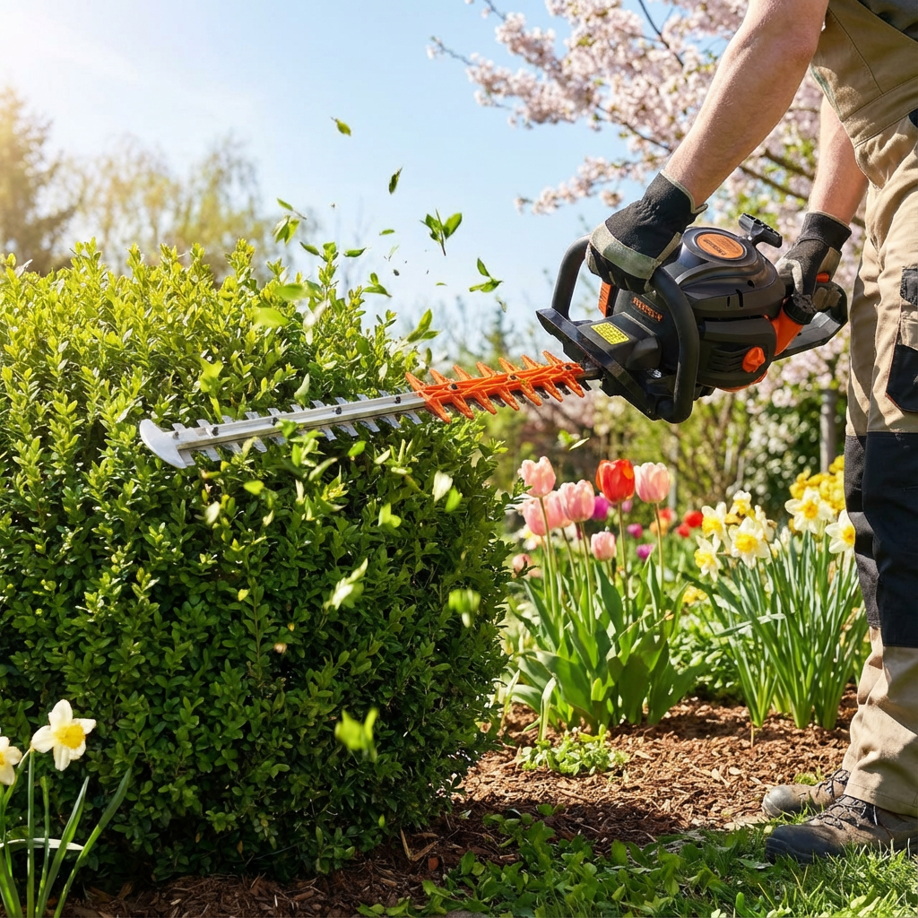 Sobald die Temperaturen dauerhaft über etwa 8–10 °C liegen und der Boden frostfrei ist, kann es losgehen. Typische Startarbeiten im Frühling sind Rasenpflege, Rückschnitt von Hecken und Sträuchern sowie das Vorbereiten von Beeten.